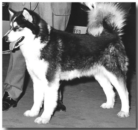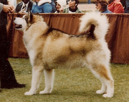 We made a fresh start in the late 1960's by acquiring our foundation bitch, Ch. Karohonta Conestoga. Connie was a California-bred, pure Kodara dog bred by Cassandra Becker Hager and was selected because she was very tightly bred (on Kobuk's Dark Beauty) and exemplified good Malamute type, confirmation, balance and movement. This important bitch, Connie, finished her championship entirely owner-handled, taking both the New York-New Jersey AMCA Area Specialty under legendary breeder & judge Short (Eva B.) Seeley and the Mid-East AMCA Area Specialty under highly respected all breed judge, Melbourne T. Downing.